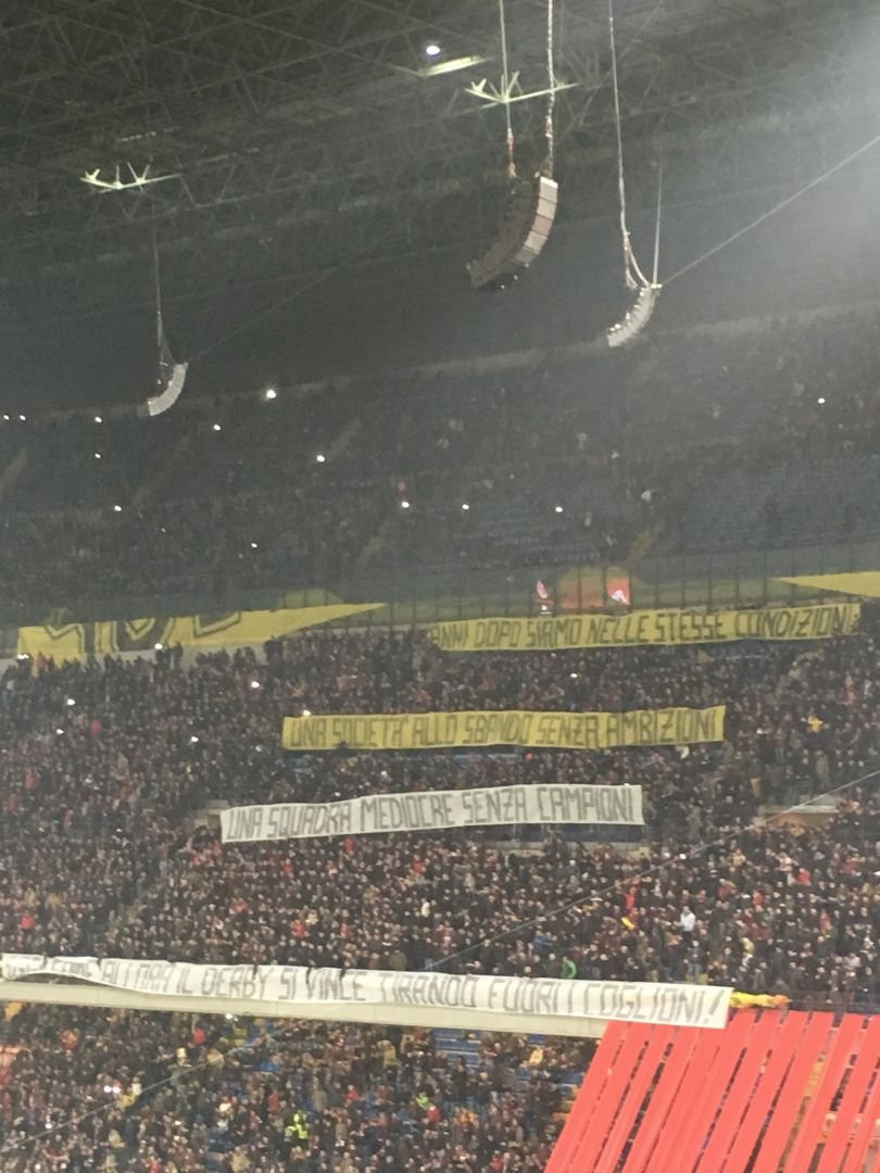 Derby ormai davvero alle porte, coreografie e… Non solo, sugli spalti di San Siro. Specie nella curva del Milan, con il settore più caldo del tifo rossonero che ha voluto ribadire ancora una volta la propria posizione nei confronti della società con uno striscione, incitando la squadra a dare di più e ricorrendo ad un esempio del passato: “30 anni dopo siamo nelle stesse condizioni: una società allo sbando senza ambizioni, una squadra mediocre senza campioni. Oggi come allora il derby si vince tirando fuori i c******i“. Ecco le foto: