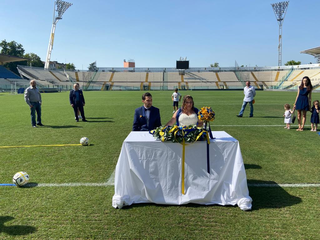 Le campane della chiesa, gli invitati seduti sulle panche di legno e una marcia nuziale fino all’altare, il tutto accompagnato dalla musica di Wagner al pianoforte. È più o meno così che molti uomini e donne immaginano il proprio matrimonio dei sogni. Per Cristian Reggiani ed Elena Venturelli, però, le cose sono andate un po’ diversamente, trascendendo i loro desideri più inaccessibili, specialmente per la scenografia della cerimonia. Un castello? No, il Braglia di Modena. Proprio così: lo stadio dei gialloblù ha ospitato oggi, 18 giugno, le nozze dei due tifosi, che hanno potuto vivere la giornata più bella della propria vita in quella che è la loro seconda casa.
