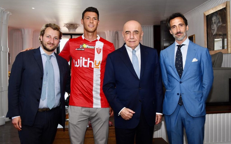 In alto, un’altra immagine di Mazzitelli dopo la firma insieme ad Adriano Galliani e agli agenti Timmy Mescheder e Valerio Giuffrida.