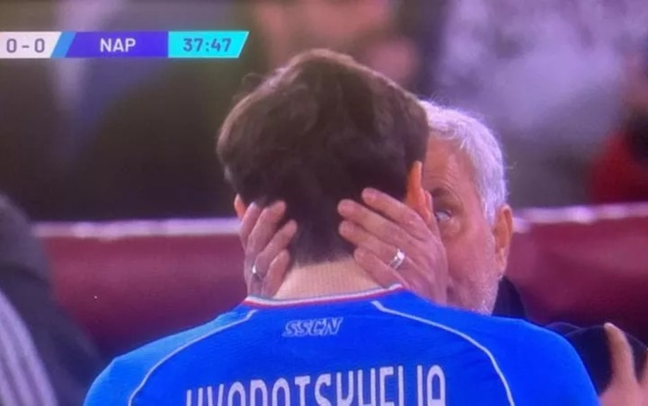 Un faccia a faccia, un cartellino giallo, poi l’abbraccio. La scena viene dal primo tempo di Roma-Napoli e coinvolge José Mourinho da una parte e Kvicha Kvaratskhelia dall’altra.
