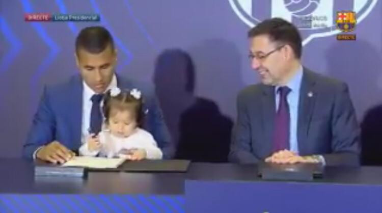 Nulla di strano se non il fatto che a firmarlo ci ha pensato… sua figlia. Mentre il papà era intento a leggere le carte, la piccola Murillo, incuriosita, andava in giro per la stanza, fino a quando il presidente del club, Josep Maria Bartomeu, non l’ha chiamata.