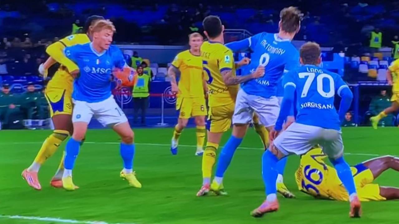 Annullato il gol del momentaneo pareggio del Napoli contro il Verona: fallo di mano dell’attaccante danese prima di calciare in porta