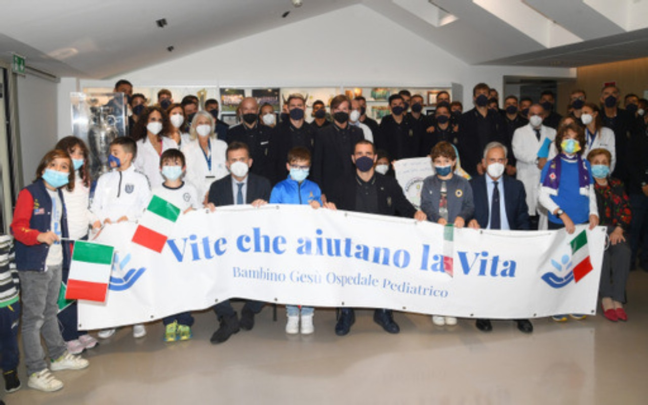 Prima della visita nei reparti, i Campioni d’Europa, con la loro Coppa, hanno incontrato un gruppo di bambini ospiti delle case di accoglienza dell’Ospedale per la consegna dei doni: le felpe con il logo del Bambino Gesù e della Federcalcio, un gagliardetto realizzato dai bambini e dai ragazzi della Ludoteca e un cartellone con scritto “Sul campo e nella vita insieme vinciamo la partita”.