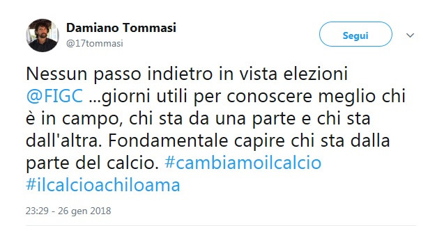 Assemblea di fuoco in Lega, le riunioni hanno portato a spaccature e litigi, ma non al ritiro di Damiano Tommasi. L’ex Roma e Verona smentisce le voci che circolavano ieri e va avanti con la sua candidatura alla presidenza della Figc come conferma un tweet apparso nel suo profilo:”Nessun passo indietro in vista elezioni FIGC… – scrive Tommasi – Giorni utili per conoscere meglio chi è in campo, chi sta da una parte e chi sta dall’altra. Fondamentale capire chi sta dalla parte del calcio”.
