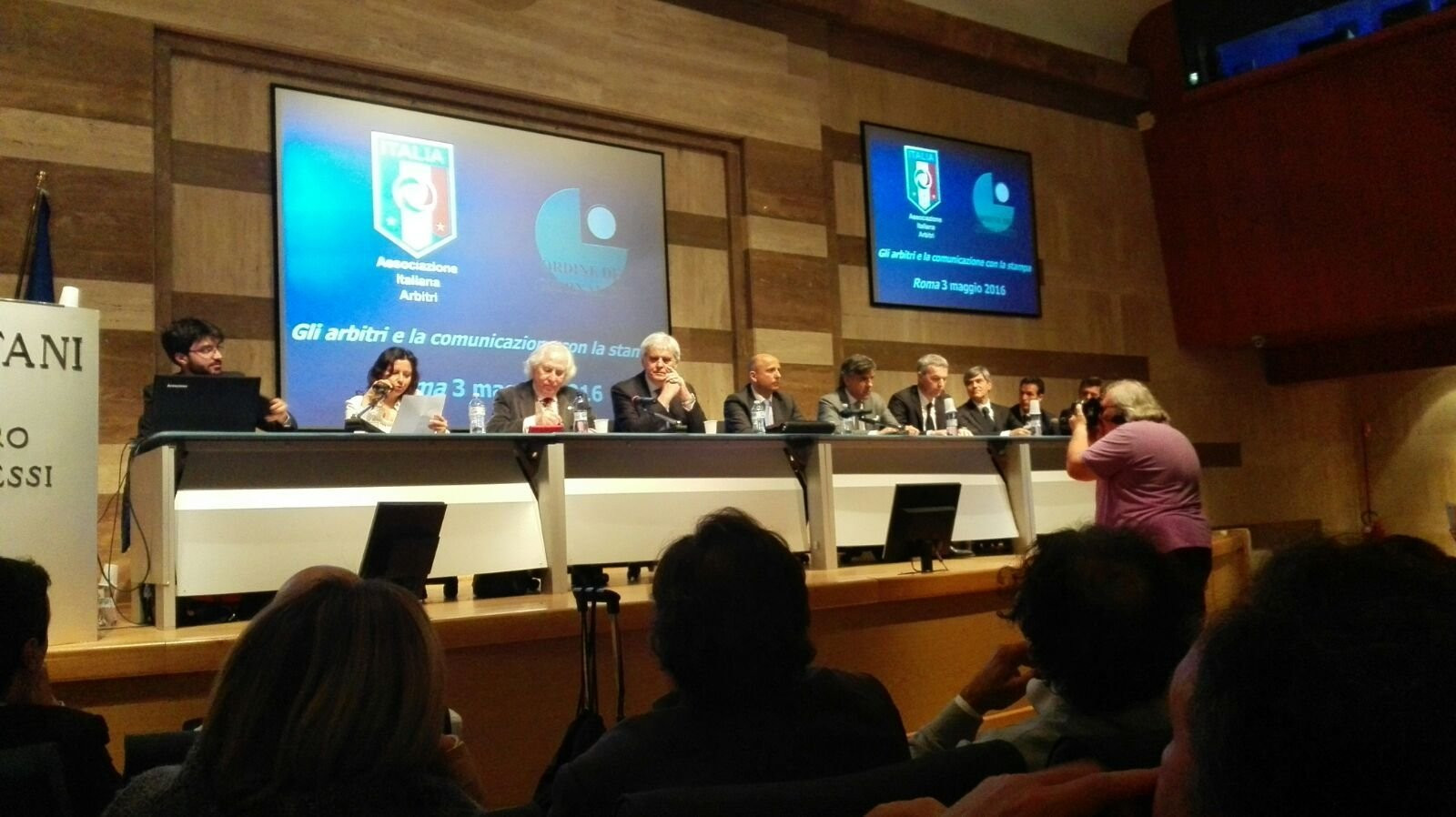 Si è svolto questa mattina a Roma un incontro tra l’Associazione Italiana Arbitri e l’Ordine dei Giornalisti, con il tema di fondo “Gli arbitri e la comunicazione con la stampa”. Nel corso dell’evento si sono succeduti gli interventi di diverse personalità di spicco dell’A.I.A.: dal presidente Marcello Nicchi ai designatori di Serie A e Serie B, Domenico Messina e Stefano Farina, fino agli arbitri in attività Gianluca Rocchi, Paolo Valeri e Luca Banti.