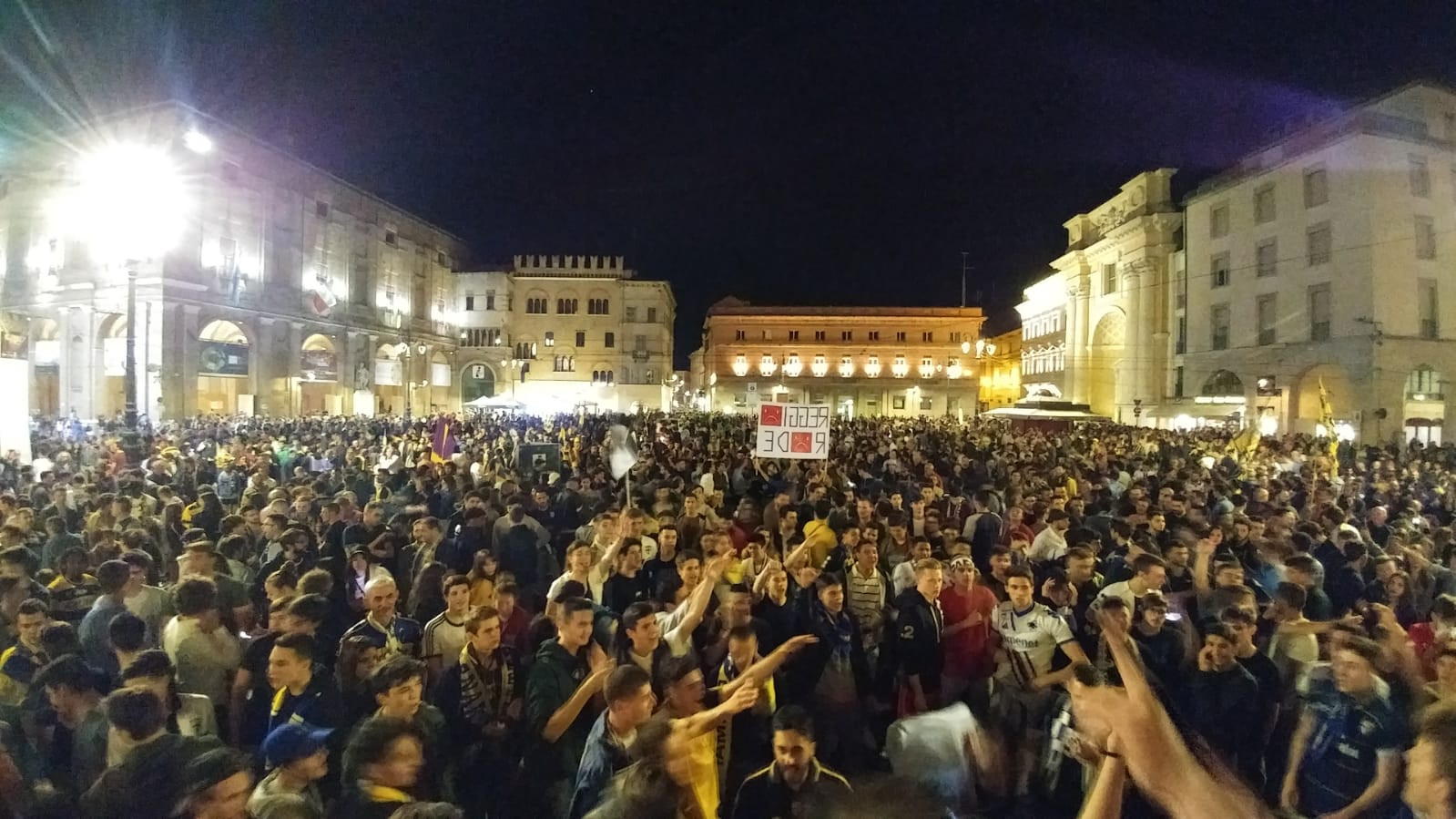 La festa continua per il Parma e per i tifosi gialloblù. Dopo la vittoria contro lo Spezia (ed il pareggio del Frosinone) che è valsa la Serie A, per i crociati sono partiti i festeggiamenti per la promozione. Prima in campo, poi negli spogliatoi. I tifosi rimasti a casa, invece, hanno presto riempito le vie della città e soprattutto piazza Garibaldi che si è subito colorata di gialloblù. Tanto entusiasmo e cori, soprattutto per Lucarelli, perché questa notte Parma non dorme, vuole solo festeggiare questo traguardo: la terza promozione consecutiva e la terza della storia in Serie A.
