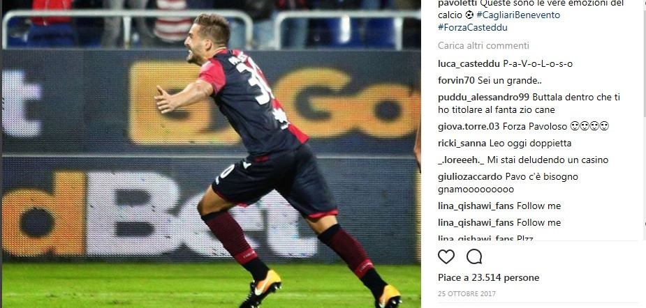 “Partita pazzesca, vittoria pazzesca” la frase per festeggiare i tre punti di ieri. Un bomber e un ragazzo d’oro, a Cagliari già lo amano: d’altronde lui è Pavoloso…