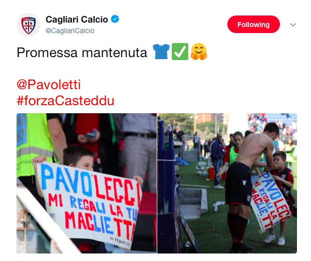 Molti ci provano, invano, negli stadi di tutto il mondo, con lo stesso identico sistema: ma il piccolo protagonista della bella storia che ci ha regalato lo scorso weekend di Serie A, puntando su un gioco di parole mica male, ha saputo centrare il cuore dell’attaccante del Cagliari con merito. “PavoLeggi, mi regali la tua maglietta?“: detto, fatto. Perchè è bastato uno sguardo dell’attaccante verso la tribuna della “Sardegna Arena”, a fine gara, per rendere felicissimo con un semplice gesto un fan sfegatato: maglia ceduta, con tanto di carezza, e…promessa mantenuta, come ricordato dall’account Twitter ufficiale rossoblu. Dimenticando l’occasione d’oro fallita nel corso del match, che avrebbe potuto regalare punti salvezza importanti al Cagliari, e mangiandosi con gli occhi quegli ingredienti capaci di colpire dritto al cuore. Mescolati e preparati dal piccolo Federico.