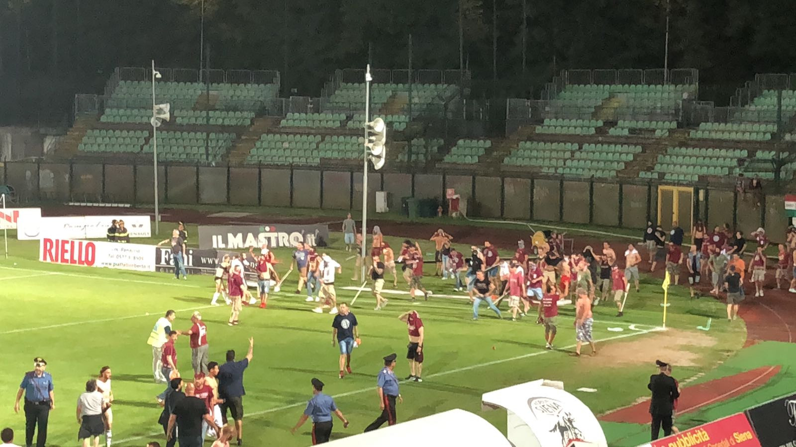 Il gruppo presto è diventato più corposo sul terreno di gioco, tanto che è dovuta intervenire la polizia con una carica per far rientrare la situazione e far tornare sugli spalti i tifosi.