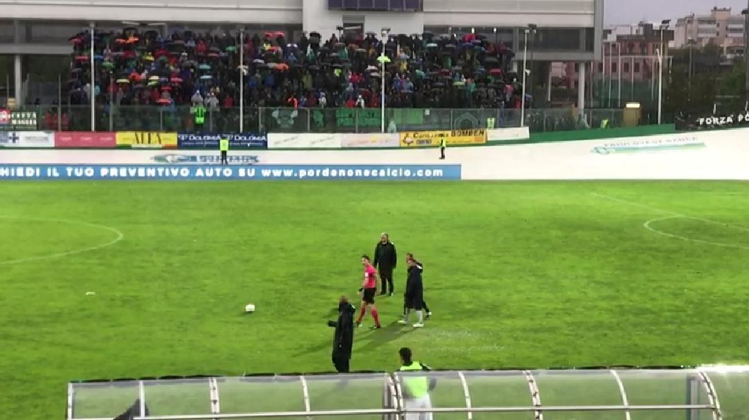 Dopo un primo tempo chiuso in vantaggio per 3-1 sulla Giana Erminio, il Pordenone è rientrato negli spogliatoi ma non è uscito subito, come gli avversari. Dopo l’intervallo di 15 minuti l’arbitro ha effettuato un sopralluogo e ha deciso di sospendere la partita per 20 minuti, in attesa che tutte le zone del campo tornassero praticabili.