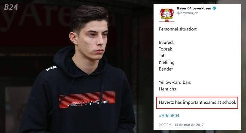 ‘La scuola è la cosa più importante‘. Prima i libri, poi il calcio. Questo l’imperativo categorico di ogni mamma. E lo sa bene, Kai Havertz. 17 anni spesi tra campi e … banchi di scuola. Storia comune, direte. Se non fosse che il ragazzino è un titolare del Bayer Leverkusen. Sì, questa sera c’è la Champions League: ritorno contro l’Atletico Madrid. Ok, c’è solo un problema: Kai non ci sarà. Infortunio? No, fuori strada. Tutta colpa dei libri. Perché un importante esame scolastico lascerà a casa il giocatore di Tayfun Korkut. Il classe 1999 non partirà per la trasferta spagnola. E sarà costretto ad osservare da casa i suoi compagni.