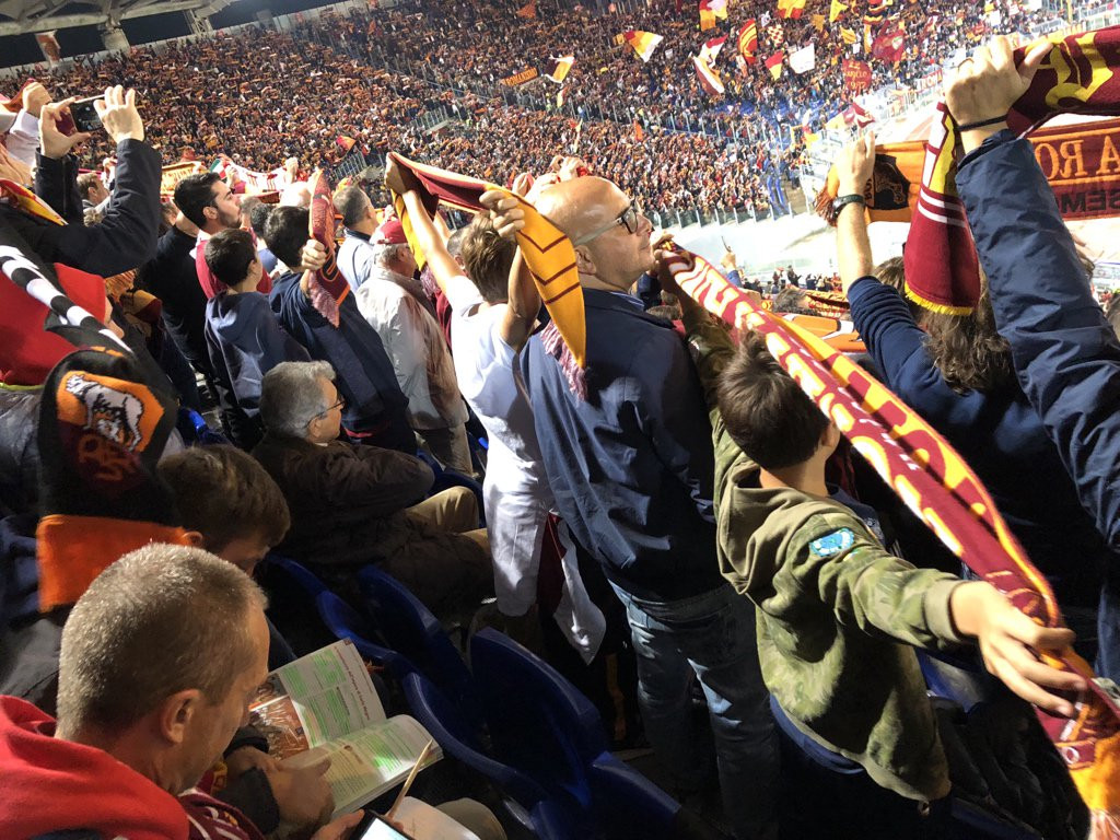 L’Olimpico gremito e quella magica atmosfera che solo le partite di Champions League sanno regalare. Come al solito, poco prima dell’ingresso delle squadre parte l’inno della Roma. Tutti i tifosi si alzano e con loro le sciarpe, per cantare a voce alta. Tutti, tranne due probabilmente. Un giovane con un libro sulle gambe, intento a fare i compiti, e con lui presumibilmente il padre che lo assiste nello studio. “Prima il dovere e poi il piacere” sarebbe una didascalia perfetta a quest’immagine. E magari, in bocca al lupo allo studente per domani se ce ne fosse bisogno.