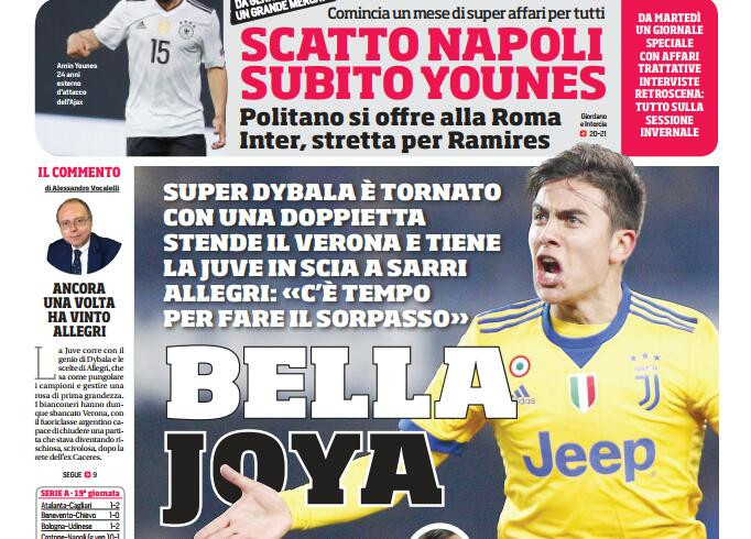 Il successo del Napoli allo Stadium contro la Juventus, sulle prime pagine dei quotidiani in edicola trova grande spazio la vittoria della formazione allenata da Sarri. “KoulibaBUM! Napoli, colpo scudetto. Straordinario gol di testa di Koulibaly, Juve battuta allo Stadium (0-1). Azzurri a meno 1, corsa al titolo riaperta”, titola il Corriere dello Sport. “Canta Napoli, piange la Juve”, il titolo principale di Tuttosport, che poi nel taglio alto scrive: “Toro, impara dall’Atalanta”. “Napoli -1, è qui la testa!” titola La Gazzetta dello Sport.