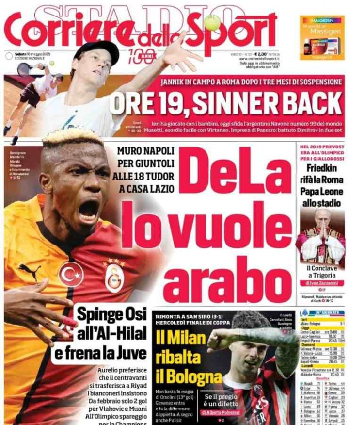 Il Corriere dello Sport apre con “Dela lo vuole arabo”, con De Laurentiis che spinge Osimhen all’Al-Hilal e frena quindi la pressione della Juventus. Il Presidente del Napoli, preferirebbe quindi che il suo attaccante si trasferisse a Riyad. Ma rimane il pressing bianconero.