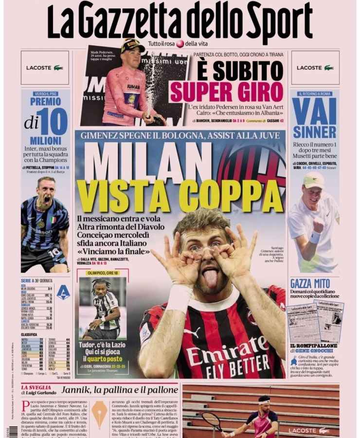 La Gazzetta dello Sport titola sul Milan e sulla sua vittoria contro il Bologna, nella gara inaugurale della 36esima giornata di Serie A. Ora, per i rossoneri, testa alla finale di Coppa Italia in programma il 14 maggio sempre contro il Bologna di Italiano.