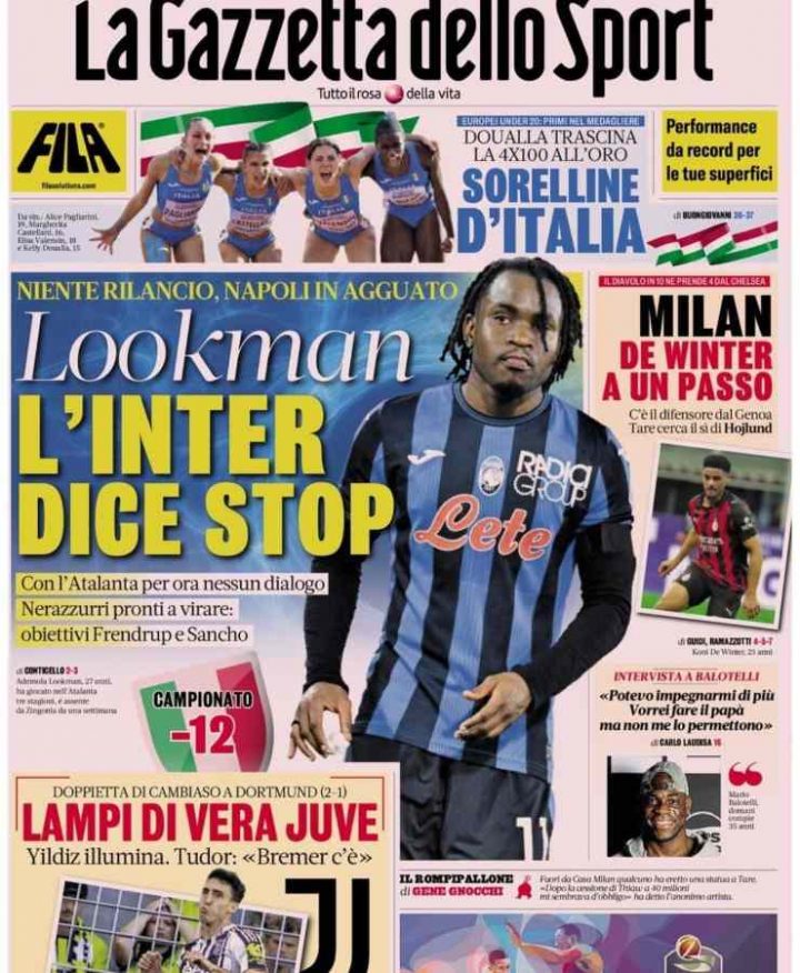 La Gazzetta dello Sport apre con “Lookman: l’Inter dice stop”. Niente rilancio dunque dei nerazzurri per l’attaccante dell’Atalanta: in agguato resta il Napoli. Taglio laterale dedicato a De Winter che negli ultimi giorni è diventato l’obiettivo numero uno per la difesa per sostituire Malick Thiaw.