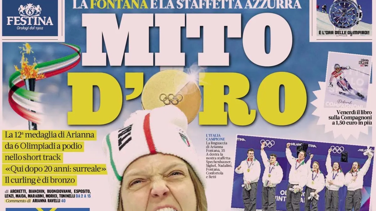 La Gazzetta dello Sport dedica quasi tutta la sua prima pagina all’ultima giornata dell’Italia nelle Olimpiadi invernali di Milano-Cortina, celebrando la medaglia d’oro di Arianna Fontana nello short track e il bronzo di Constantini-Mosaner nel curling. Spazio anche al calcio, con la Coppa Italia e l’eliminazione del Napoli per mano del Como.