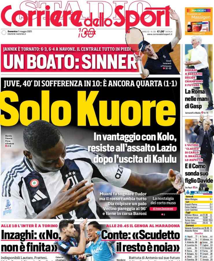 “Solo Kuore” il titolo centrale de Il Corriere dello Sport in riferimento alla rete di Kolo Muani che aveva portato i bianconeri in vantaggio nel primo tempo contro la Lazio, prima del pareggio di Vecino in extremis. Inzaghi: “No, non è finita” e Conte: “Scudetto il resto è noia” le dichiarazioni pre partita dei due allenatori di Inter e Napoli.