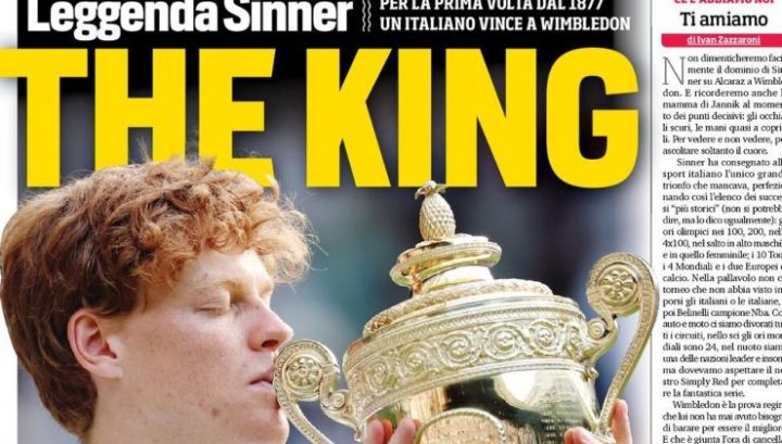 Anche Tuttosport dedica spazio in prima pagina alla vittoria di Sinner contro Carlos Alcaraz: “Signore di Wimbledon”
