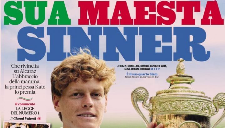 La Gazzetta dello Sport apre con il trionfo di Jannik Sinner a Wimbledon: il tennista altoatesino è diventato il primo italiano nella storia a riuscirci.
