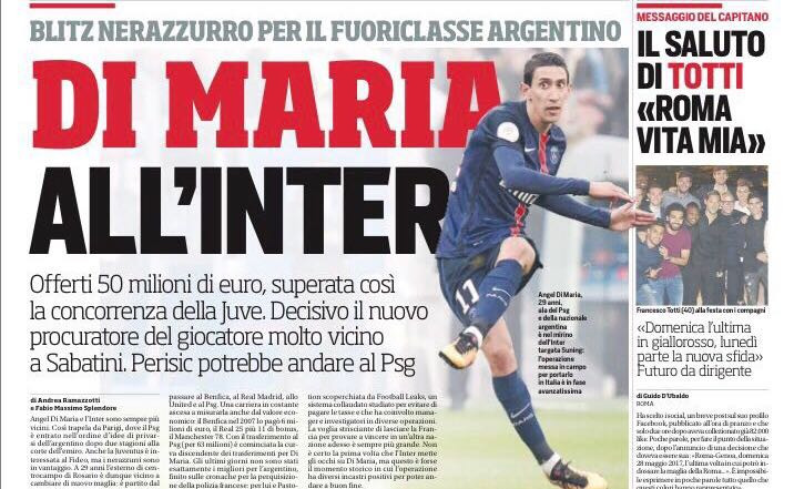 Il Corriere dello Sport apre con una notizia di mercato che può far sognare i tifosi nerazzurri: “Di Maria all’Inter”, con la società che avrebbe fatto un blitz per assicurarsi il fuoriclasse argentino. “Vi ho purgato ancora” è l’apertura de Il Tempo che dedica il centro della pagina al capitano della Roma. “Totti a sorpresa annuncia l’addio alla Roma, ma non al calcio, Città sotto choc. Giusto o sbagliato le carte le dà ancora lui”.