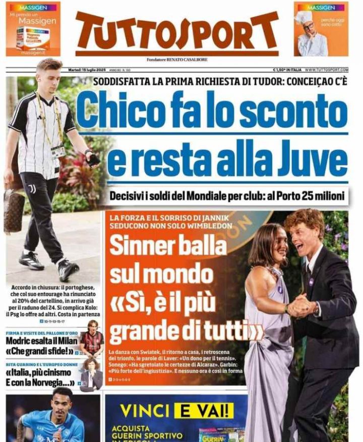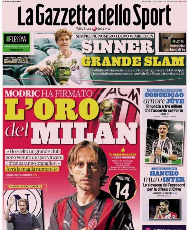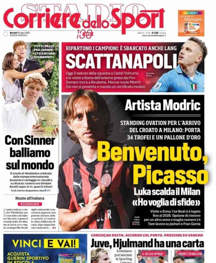 La Gazzetta dello Sport si concentra sull’arrivo di Luka Modrić a Milano: l’ex Real Madrid ha scelto la maglia numero 14. Spazio anche al mercato di Juventus e Inter e alla vittoria di Jannik Sinner a Wimbledon.Il Corriere dello Sport si concentra sull’arrivo a Milano di Luka Modrić: visite e firma per l’ex Real Madrid. Spazio anche al mercato di Napoli e Juventus oltre al ballo dei campioni di Wimbledon tra Sinner e SwiatekIl Tuttosport si concentra sulla trattativa tra la Juventus e il Porto per Francisco Conceição. Spazio all’arrivo di Modrić e alla vittoria di Jannik Sinner a Wimbledon