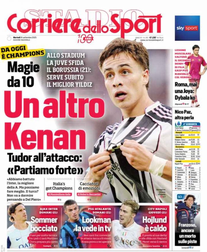 Il Corriere dello Sport apre con Kenan Yildiz e la Juventus, mentre in basso trovano spazio le altre italiane.