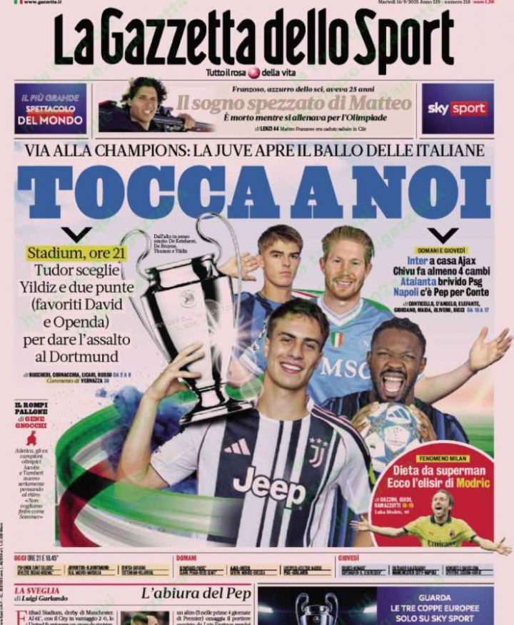 La Gazzetta dello Sport apre con l’inizio della Champions League: la Juventus è la prima squadra italiana coinvolta.