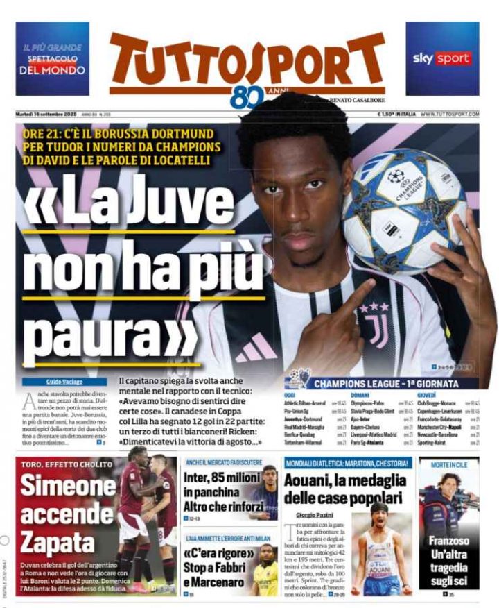 Tuttosport apre con Jonathan David e le parole di Locatelli, in conferenza stampa.