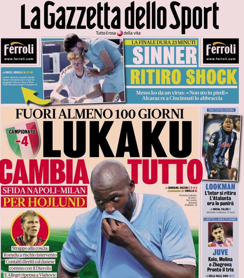 La Gazzetta dello Sport apre con l’infortunio di Lukaku e i tempi di recupero dell’attaccante. A seguire, c’è spazio anche per Sinner e Lookman.