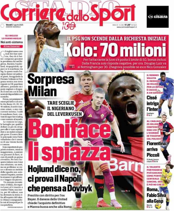 Anche il Corriere dello Sport parla di Boniface, mentre in basso trova spazio l’attacco del Napoli con Højlund e Dovbyk.