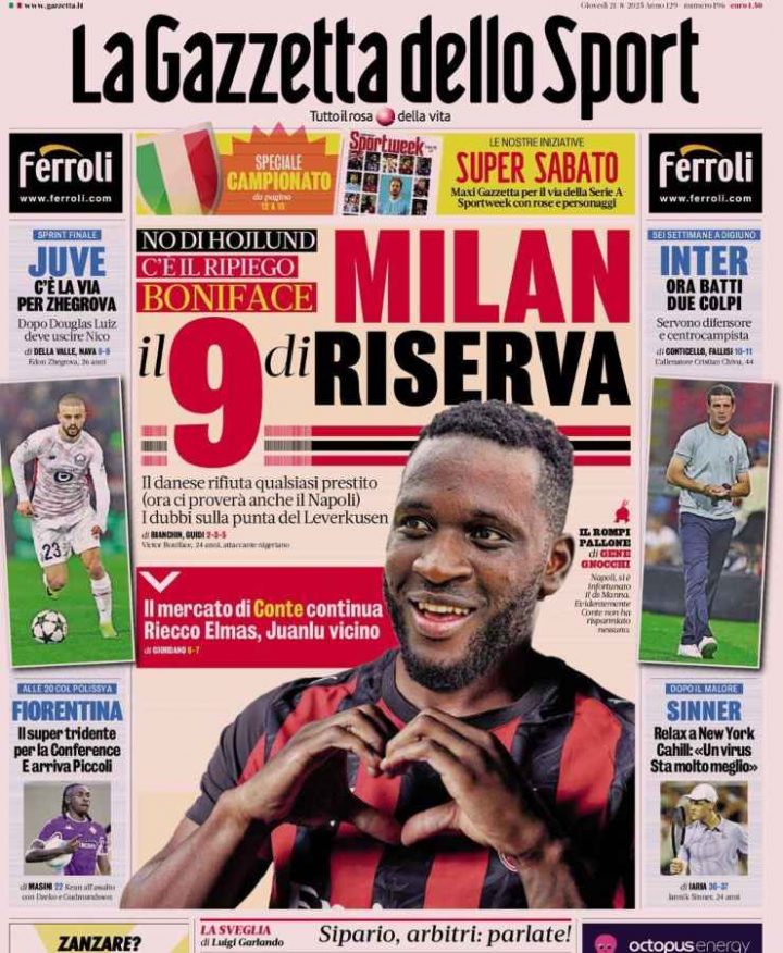 La Gazzetta dello Sport apre parlando di Milan, in particolare dell’imminente arrivo di Victor Boniface.