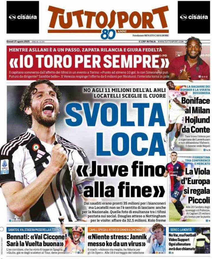Tuttosport parla di Manuel Locatelli, e della sua scelta di rimanere a Torino, sponda Juventus.