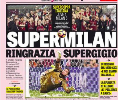 È stato il giorno della gloria per il Milan di Montella, tornato a vincere un trofeo – la Supercoppa TIM – a cinque anni dall’ultima volta. Gioia incontenibile, Juventus battuta per la seconda volta in stagione. Le prime pagine dei principali quotidiani sportivi si concentrano inevitabilmente sulla gara.