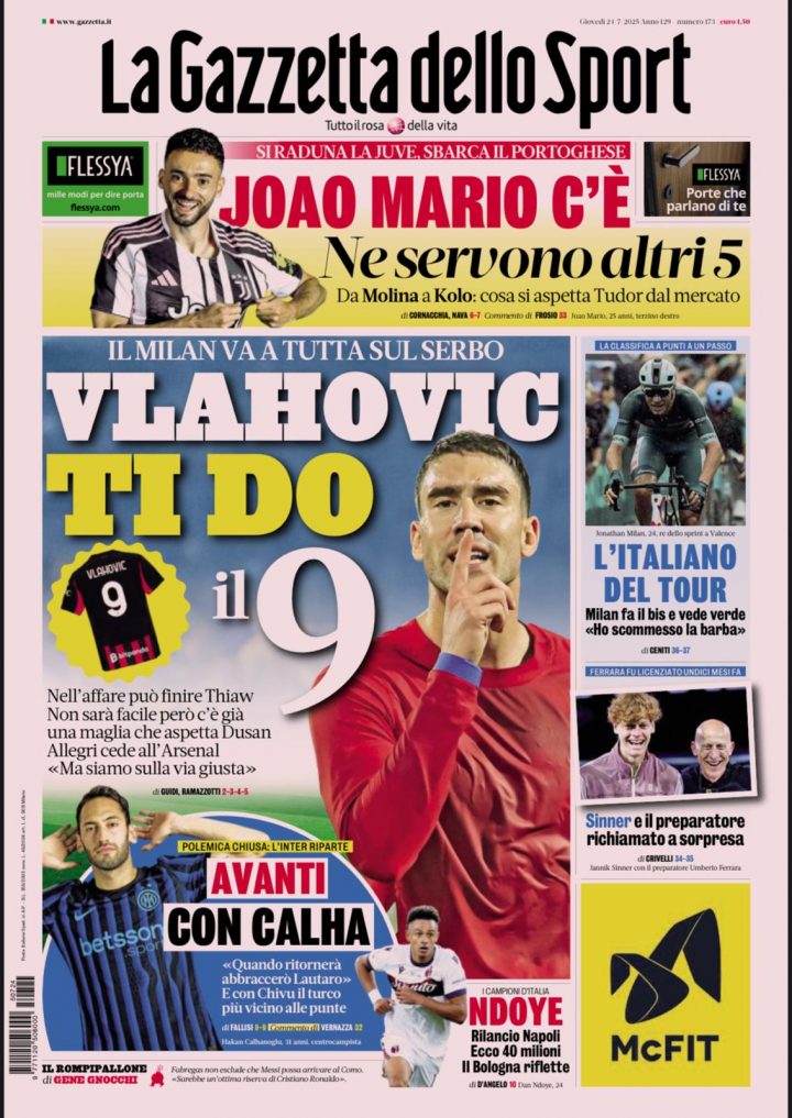 La Gazzetta dello Sport apre parlando di Dusan Vlahovic, attaccante della Juventus che il Milan vorrebbe per rinforzare il proprio attacco. Spazio poi alle parole di Calhanoglu sull’Inter, sull’affare Ndoye-Napoli e sull’arrivo di Joao Mario alla Juventus.