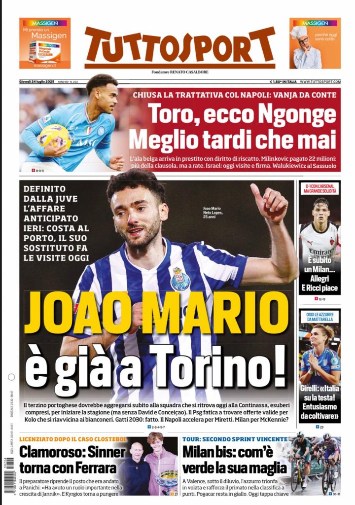 Tuttosport, infine, dedica la prima pagina a Joao Mario, nuovo acquisto della Juventus in arrivo dal Porto. In apertura anche l’arrivo di Ngonge al Torino dal Napoli .