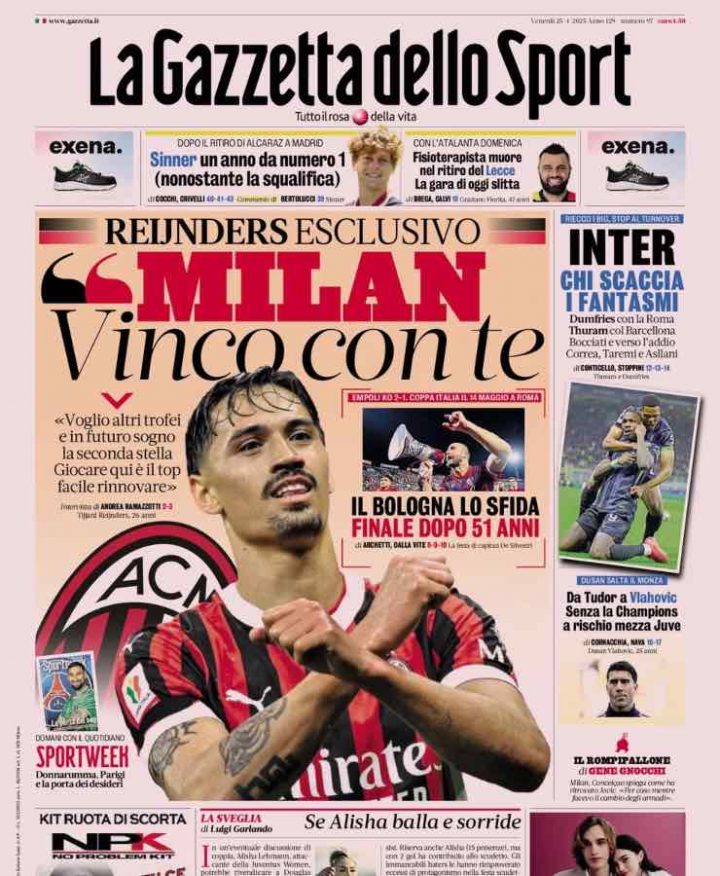 La Gazzetta dello Sport apre l’edizione odierna con l’intervista di Tijjani Reijnders ai propri microfoni, in cui parla di diversi temi tra cui il futuro e il sogno della seconda stella.