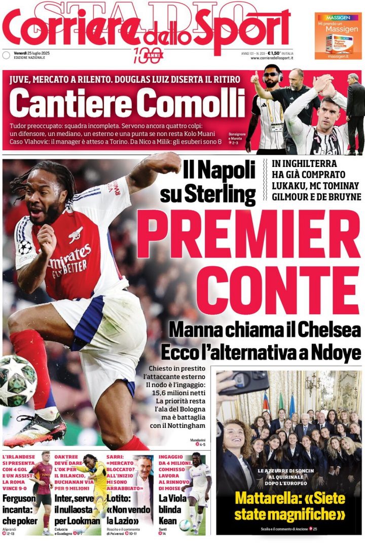 La Gazzetta dello Sport apre con il caso Douglas Luiz-Juventus. Il quotidiano apre con l’idea Sterling in casa Napoli e l’all-in del Milan su Ardon Jashari del Bruges.