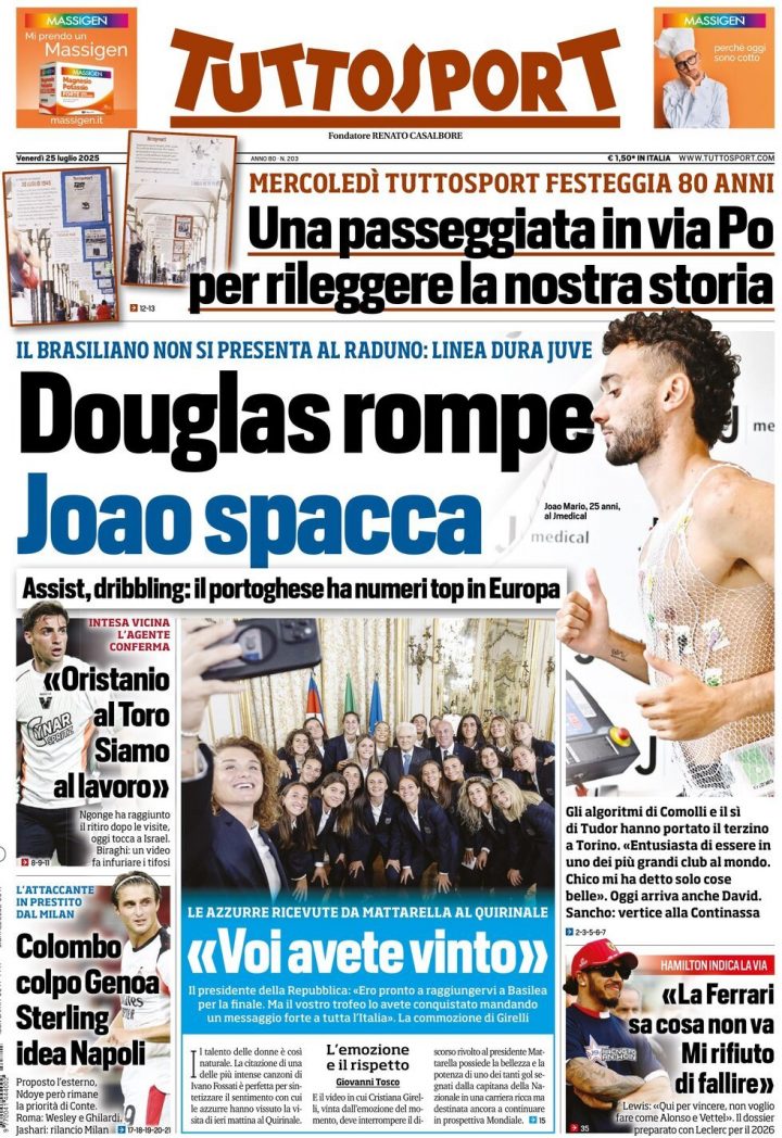 Tuttosport dedica la prima pagina alla spaccatura tra Douglas Luiz e la Juventus. Sempre in chiave bianconera, il quotidiano scrive anche di Joao Mario, nuovo acquisto del club di Tudor. Spazio in prima pagina anche all’incontro tra la Nazionale femminile e il presidente della Repubblica Sergio Mattarella.