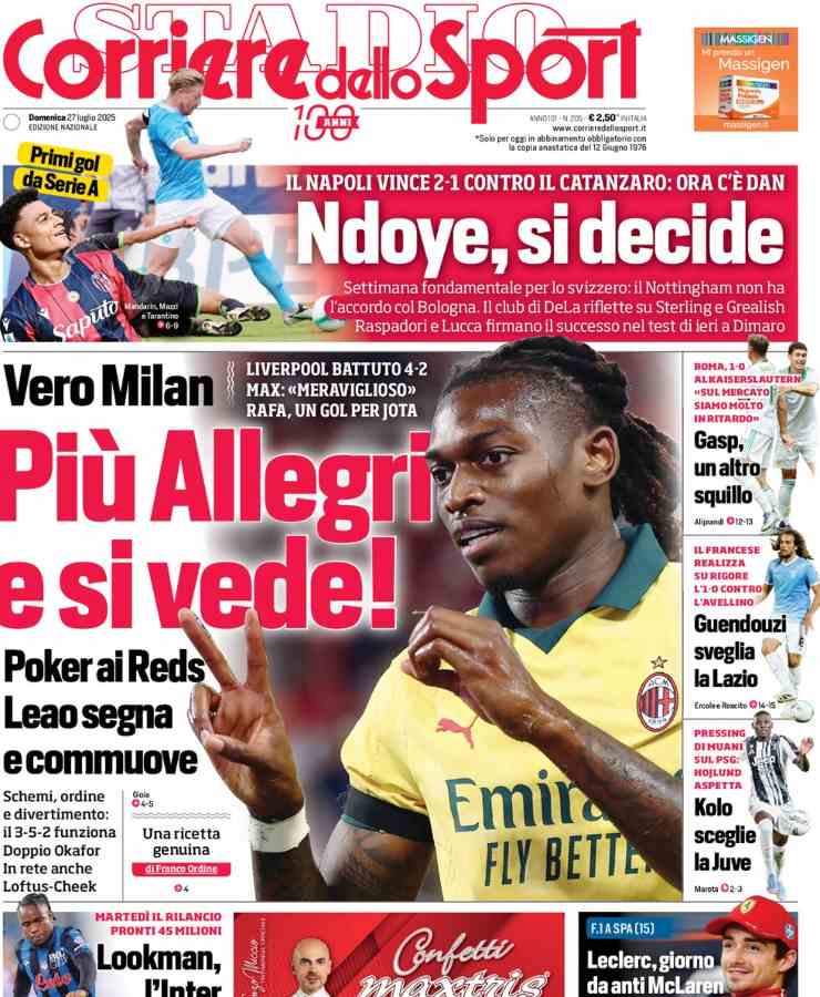 Anche il Corriere dello Sport apre con la vittoria del Milan in precampionato contro il Liverpool: poi, si parla di calciomercato. Dal Napoli all’Inter, passando per Juventus e Roma.