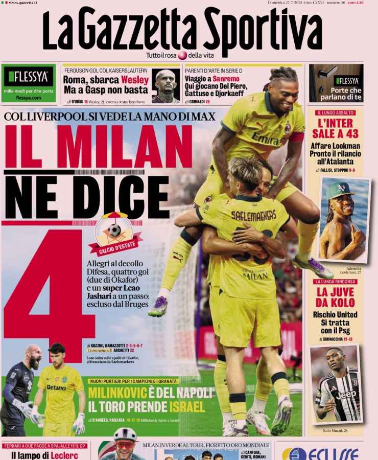 La Gazzetta dello Sport apre con la vittoria per 4-2 del Milan – nella tournée asiatica – contro il Liverpool. Poi, spazio al calciomercato: dai portieri di Torino e Napoli alle operazioni di Roma e Juventus.