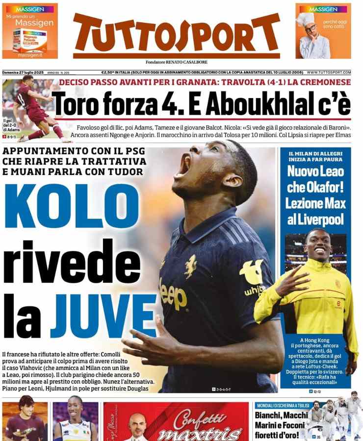 Tuttosport dedica la prima pagina alla Juventus, in particolar modo alla trattativa che potrebbe riportare Kolo Muani in bianconero. Spazio anche a Milan e Torino: si parla di pallavolo e dei Mondiali di scherma.