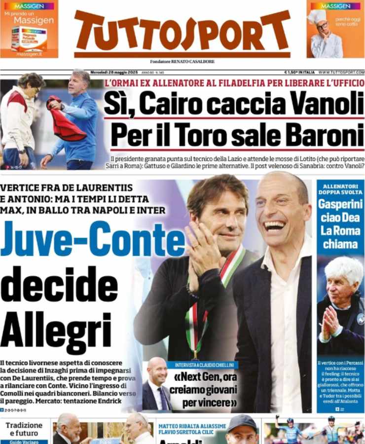 Stesse tematiche anche su Tuttosport, dove il focus principale è l’allenatore della Juventus. In alto anche la situazione Torino, con Vanoli verso l’addio: al suo posto potrebbe arrivare Baroni.