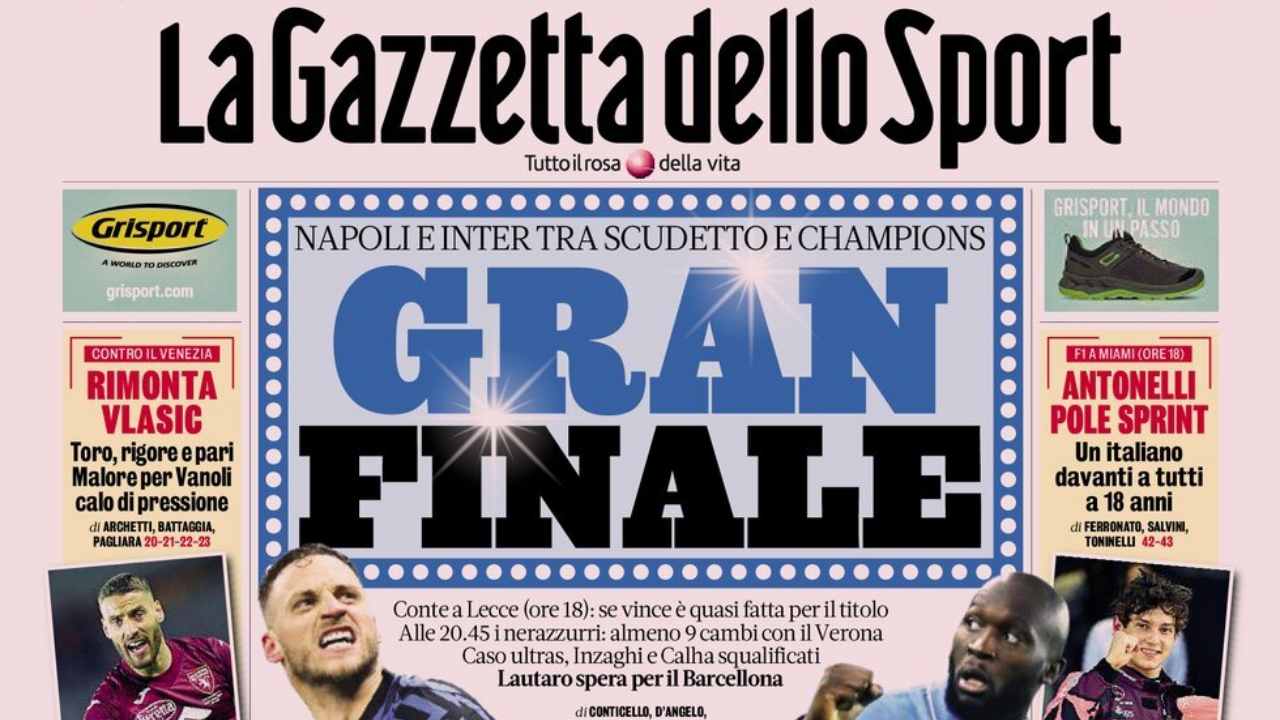 La Gazzetta dello Sport apre l’edizione odierna con uno spazio al duello Scudetto tra Napoli e Inter, impegnate entrambe sabato rispettivamente alle 18:00 contro il Lecce e alle 20:45 contro l’Hellas Verona.