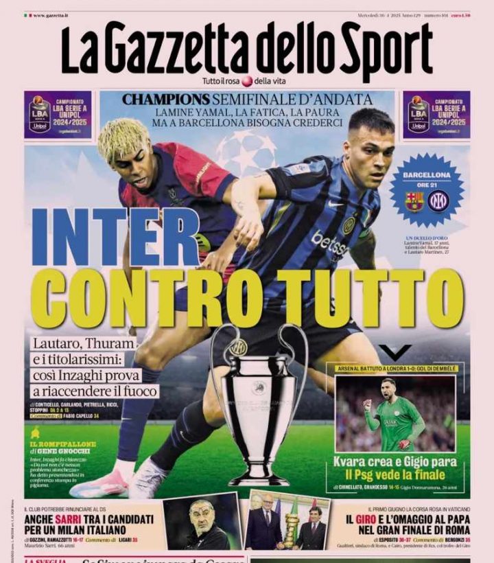 La Gazzetta dello Sport apre con la super partita di questa sera tra Barcellona e Inter, valida per l’andata delle semifinali di UEFA Champions League.