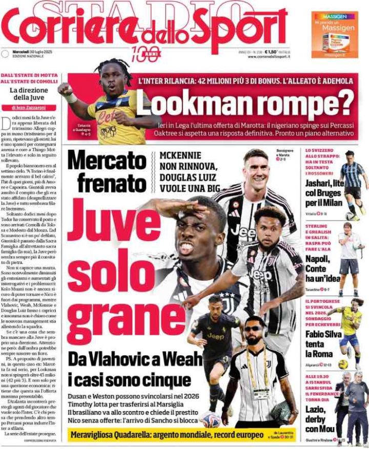 Focus Juventus, invece, per il Corriere dello Sport. “Juve solo grane” è il titolo scelto, con ben 5 casi di 5 giocatori diversi che vengono analizzati. Da Weah a Douglas Luiz, passando per McKennie. In alto spazio a Lookman-Inter e sulla destra vari focus mercato per Lazio, Roma, Napoli e Milan.
