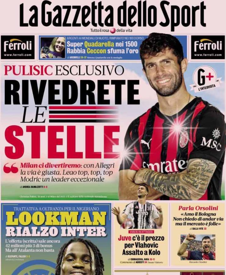 La Gazzetta dello Sport di oggi, mercoledì 30 luglio 2025, apre con un’intervista a Pulisic, che promette divertimento e risultati. In alto spazio all’argento straordinario di Simona Quadarella nei 1500 stile libero ai Mondiali di Singapore con Record Europeo (e Italiano) per oltre 7 secondi, oltre che alla rabbia/consapevolezza di Thomas Ceccon per il secondo posto nei suoi 100 dorso. In basso invece spazio al rialzo Inter per Lookman, alla situazione Vlahovic e a un’intervista a Orsolini.
