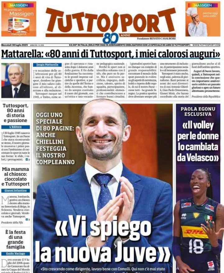 Edizione speciale per gli 80 anni di Tuttosport, infine, che per festeggiare pubblica uno speciale proprio di 80 pagine. Focus principale e apertura sull’intervista a Giorgio Chiellini tra passato, presente e futuro alla Juventus con aneddoti speciali. In alto spazio al messaggio di Mattarella per il compleanno del giornale, mentre sulla destra un’intervista esclusiva a Paola Egonu sul volley femminile e su Velasco, a pochi giorni dalla vittoria della Nations League.