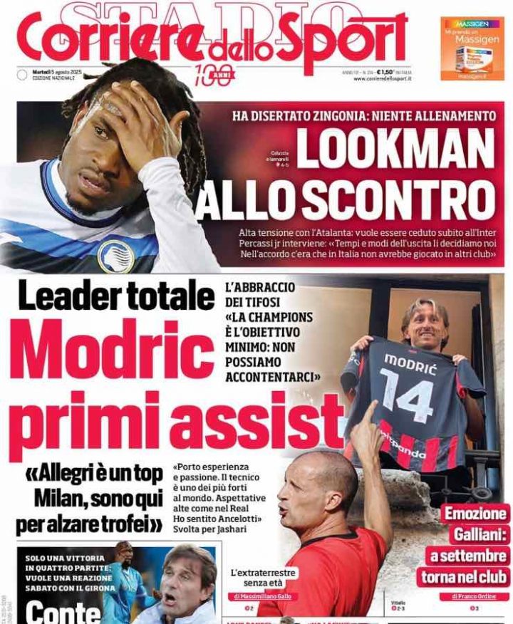 Il Corriere dello Sport, invece, divide la prima pagina tra Inter e Milan. In alto spazio a Lookman, che ha deciso di disertare gli allenamenti a Zingonia per forzare l’uscita dall’Atalanta in direzione Inter. Con taglio centrale, spazio di nuovo alla presentazione di Modric, mentre in basso Conte e la reazione dopo le amichevoli perse.