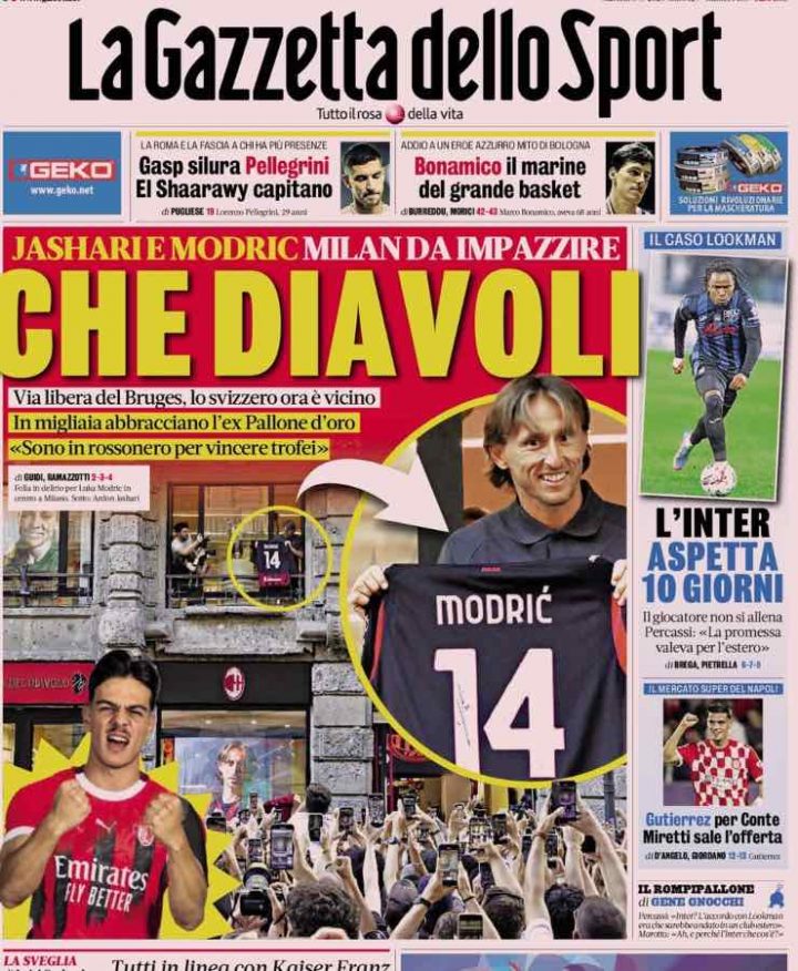 Si infiamma il mercato del Milan con la presentazione di Modric davanti ai tifosi e la trattativa per Jashari che sembra sbloccarsi e potrebbe arrivare a capolinea dopo quasi due mesi. La Gazzetta dello Sport titola infatti “Che diavoli”. In giro, spazio a Lookman-Inter, Gutierrez-Napoli e alle dichiarazioni di Gasperini.